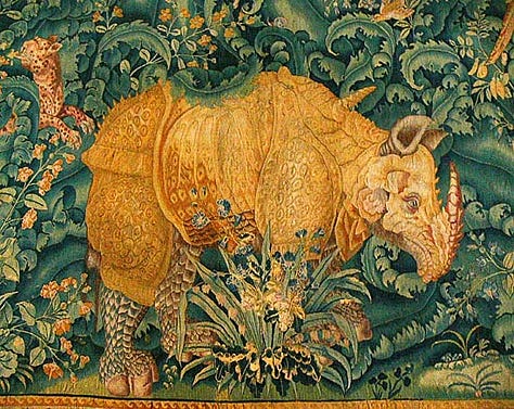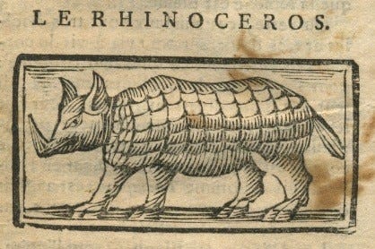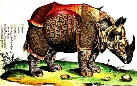 El Rhinoceros representa al ejemplar de rinoceronte indio llegado a Portugal a principios de 1515. El animal —tan extraño en Europa que era una criatura legendaria incluida en los bestiarios— causó enorme sensación porque era el primer ejemplar que se veía en el continente desde el Imperio romano. Por desgracia, el pobre animal no duró mucho: el barco en que Manuel I, rey de Portugal, lo envió como presente al papa Leon X naufragó frente a las costas italianas en 1516.